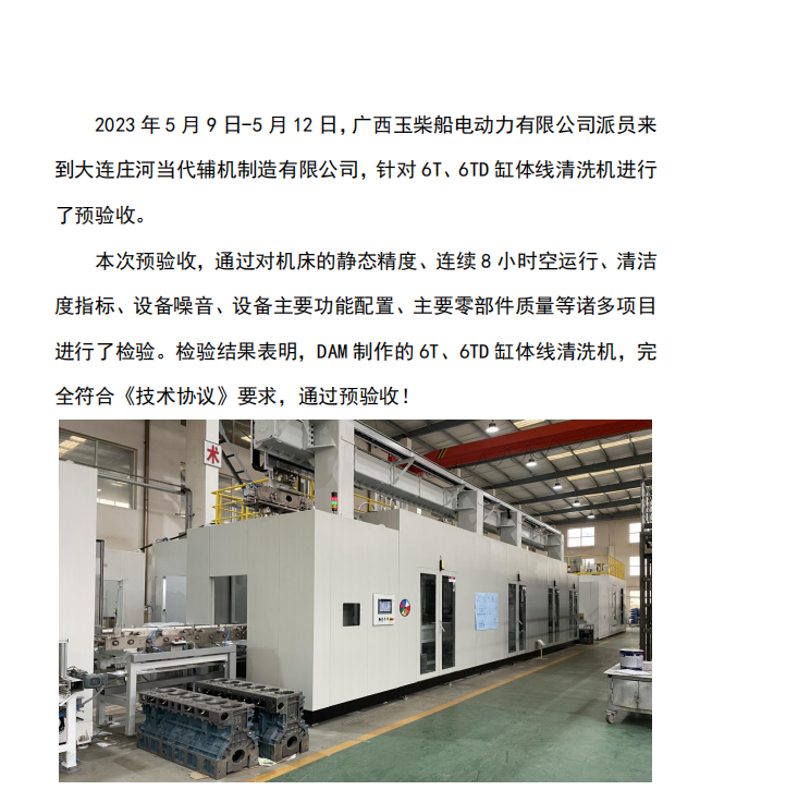 DAM為廣西玉柴船電動力有限公司承制的“6T、6TD缸體線清洗機”順利通過預驗收!