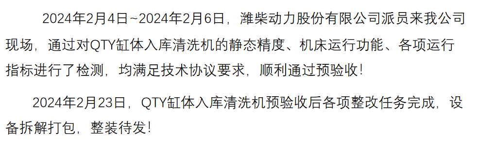 熱烈祝賀濰柴動力股份有限公司QTY線缸體入庫清洗機順利通過預驗收,整裝待發!