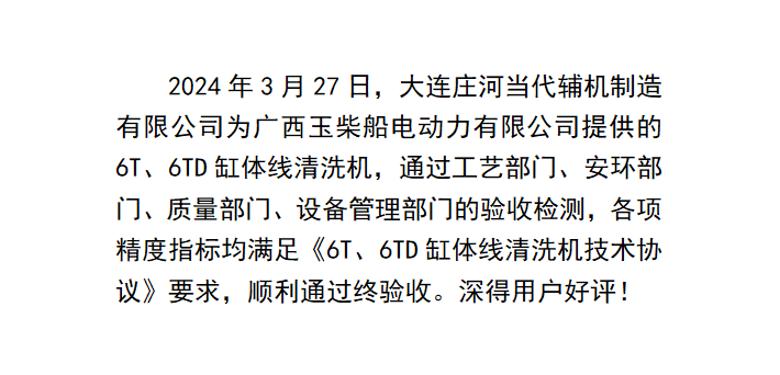 熱烈祝賀廣西玉柴船電動力有限公司6T、6TD缸體線清洗機順利通過終驗收!