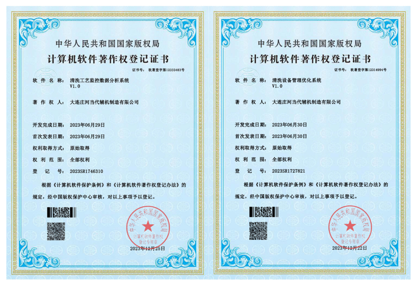 ? ? ? ?2023年12月22日、 2023年12月25日,中國人民共和國國家版權局分別向著作權人大連莊河當代輔機制造有限公司頒發了《計算機軟件著作權登記證書》。