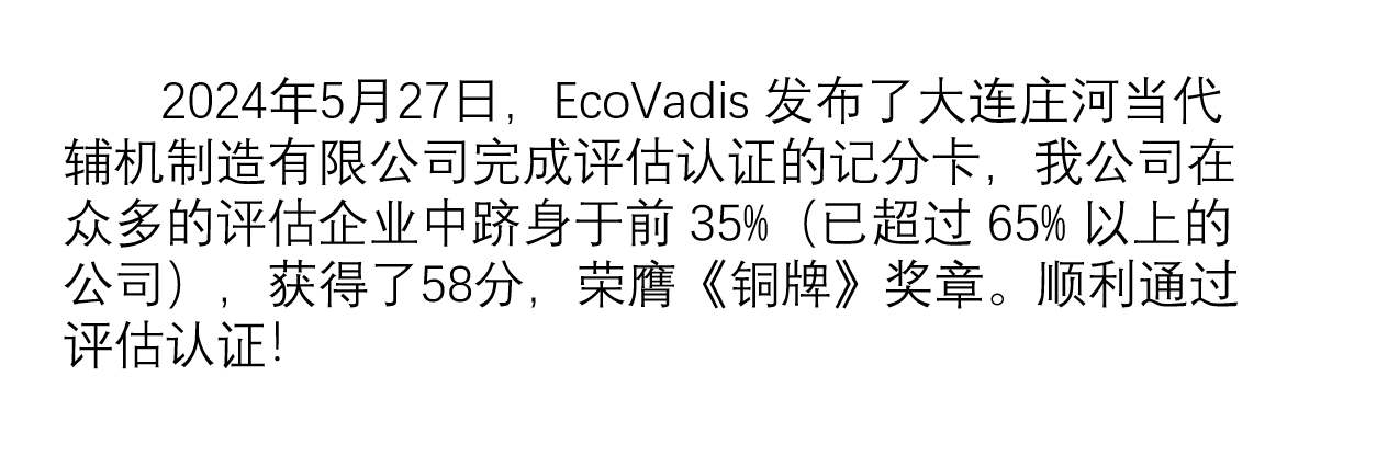 熱烈祝賀大連莊河當代輔機制造有限公司順利通過EcoVadis評估認證